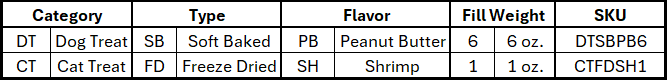 Clients can use a SKU format of their preference. Below is an example of a SKU structure for a pet treat company: