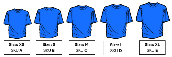 Example: a 'Plain Blue T-Shirt' that comes in 5 different sizes, needs 5 SKUs - one SKU per size variant: