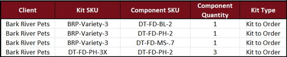 - Fill out the Excel Template with necessary Kit information. Fill out one row per Kit component; all data columns must be filled out. Multiple Kit-SKUs may be set up using one template file (include data on subsequent rows). Once all kit components and quantities are completely filled out, save the file.