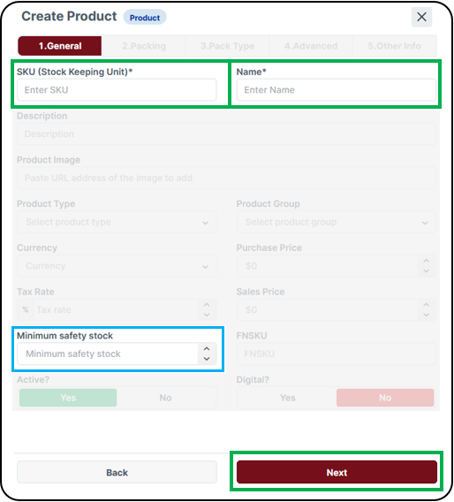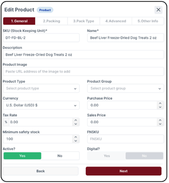 - Enter a SKU and a Name. Optional: enter a 'Minimum Safety Stock' quantity; when available inventory is below this quantity, clients will be notified via email. Do not fill out any other fields. Select Next button, until you reach the 'Pack Type' tab.