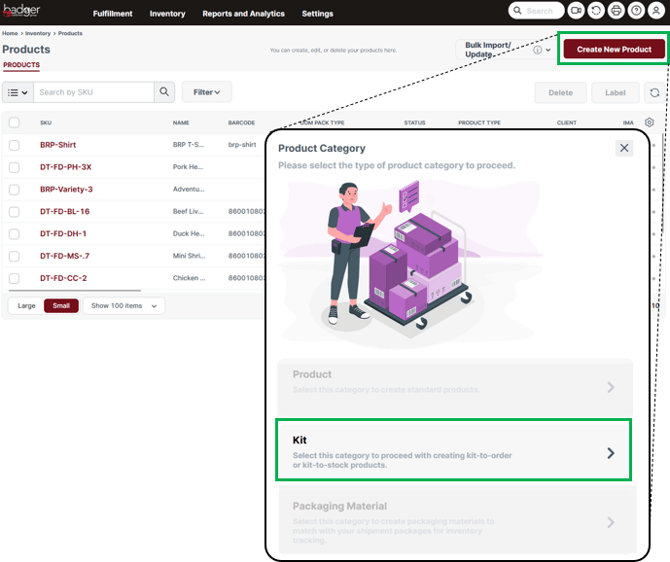 - Navigate to your Products Dashboard. Select Create New Product, then select Kit.