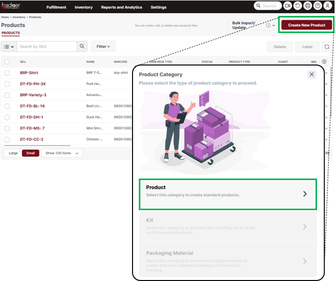 - Navigate to your Products Dashboard. Select Create New Product, then select Product (Do NOT use Category "Packaging Material" for any items).