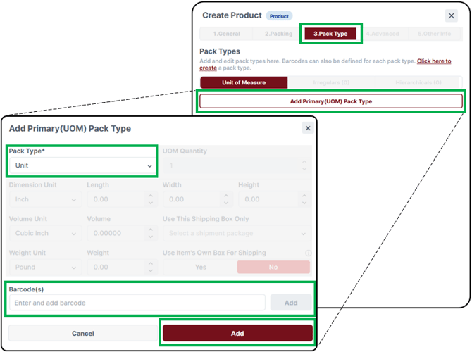 - In the 'Pack Type' tab, select 'Add Primary (UOM) Pack Type'.