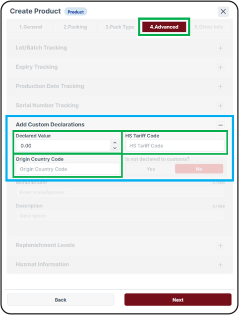 - Select Next. If this Product is shipping internationally, you must add custom declarations under the 'Advanced' tab. This is critical for international shipping label generation. The following info is required: