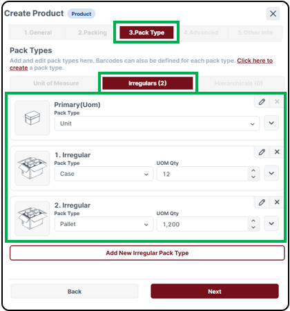 In the 'Pack Type' tab, select 'Add New Irregular Pack Type' under 'Irregulars'.