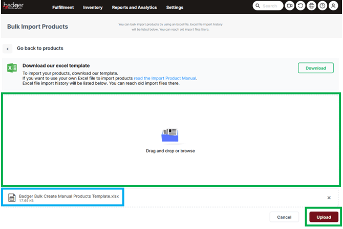 If you are creating many Product-SKUs at once, you have the option to bulk create Products, using an Excel template.