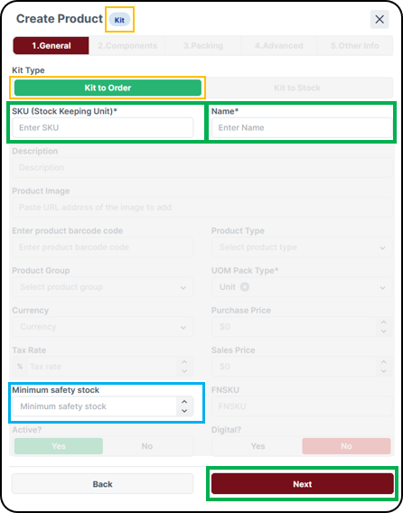 - Enter a SKU and a Name. Optional: enter a 'Minimum Safety Stock' quantity; when available inventory is below this quantity, clients will be notified via email (available kit inventory is calculated based off the available component SKU quantities). Do NOT fill out any other fields. Select Next button.
