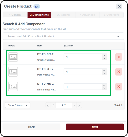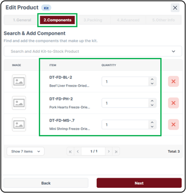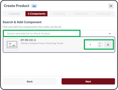- Enter a Product SKU or Name into the Search field. Enter the component quantity and then click the + icon to add the SKU to the Kit component list. Add all component SKUs Quantities contained in the kit.