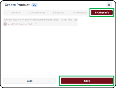 - Once all component SKUs / quantities are added in the 'Components' tab, select 'Next' until you reach the 'Other Info' tab, and then select 'Save'.
