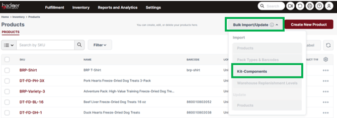 To bulk create Kits, you must first bulk create the SKUs under Category: Product; see the 'Bulk Create Products' section above. Once the Product-SKUs exist in your Dashboard, use the Badger Kit Setup Excel Template to "convert" the SKU category to: Kit, and add components.