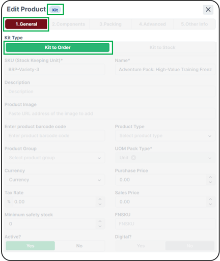 - Lastly, after any product import, double check the SKUs were properly updated in your Products Dashboard. For any affected kit SKU, pull up the "product page" and ensure the item category was successfully updated to: Kit (Type: Kit to Order).