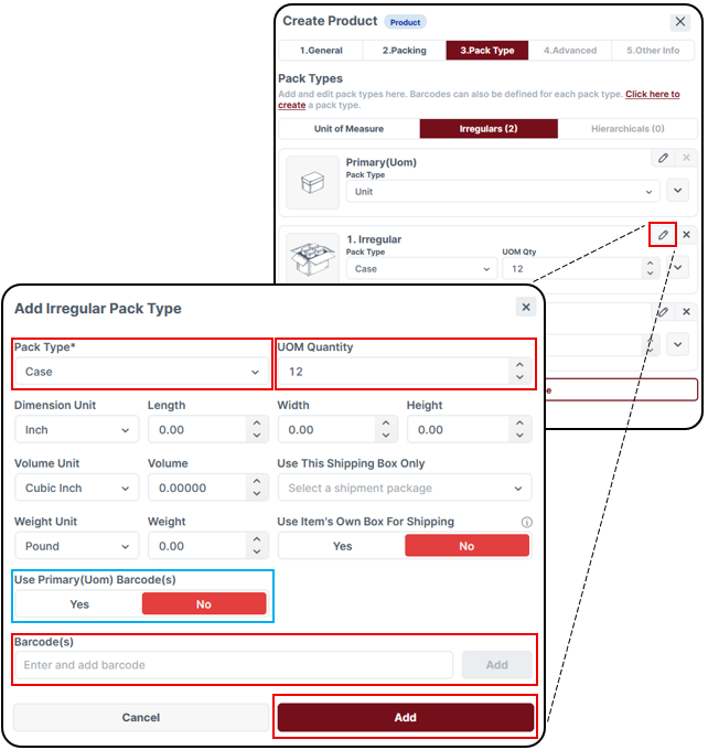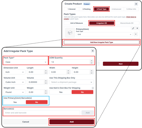 - If the Pack Type (Case) has a unique scannable barcode, add the barcode. If the Pack Type does not have a unique scannable barcode, toggle 'Use Primary (UOM) Barcode(s)' to 'Yes'.