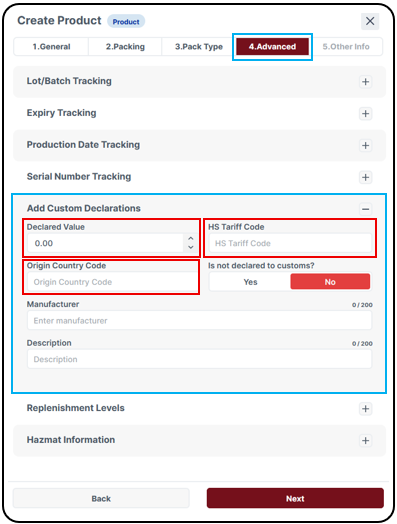 If a Product is shipping internationally, you must add custom declarations under the 'Advanced' tab. This is critical for international shipping label generation.