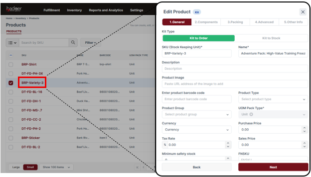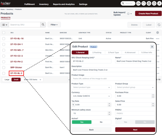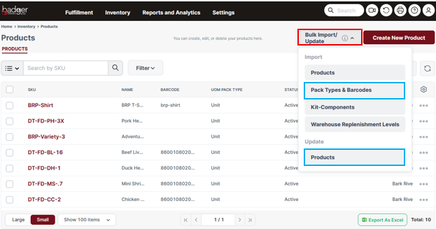 A). To bulk update Minimum Safety Stock quantities, Custom Declarations, SKU Codes, or Names, download the Badger Bulk Update Products Template.