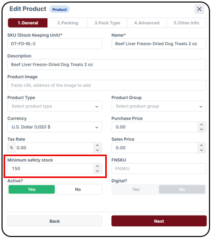If a 'Minimum Safety Stock' quantity is specified, clients will be notified via email when available inventory is below this quantity (for a Product or Kit). Available kit inventory is calculated based off of the available component inventory.