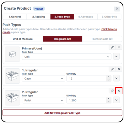 - To delete an existing Pack Type, select the X icon to the right of the Pack Type.