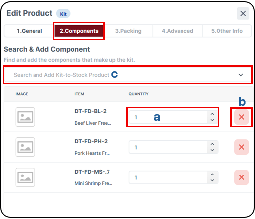 - To add a component, enter a Product SKU code or Name into the Search field. Enter the component quantity and then click the + icon to add the SKU to the Kit component list.