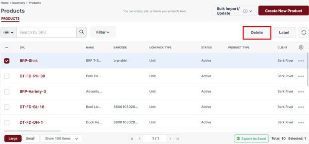 - From your Products Dashboard, select the checkbox to the left of the SKU, then select 'Delete'. Confirm this action on the pop-up screen.