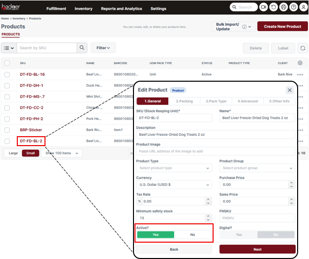 - To mark a SKU inactive, toggle 'Active?' field to "No" in the Edit Product screen. Select 'Save' in the 'Other Info' tab. Toggle 'Active?' field to "Yes" and save, to make active again.