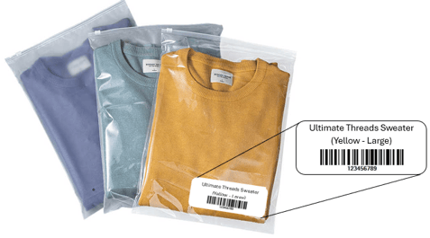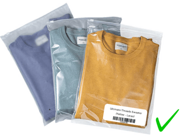 Apparel, fabric, plush, and textiles need to arrive packaged in a sealed bag (polybag) with a barcode displayed on the outside of the package; a brief product description on the barcode sticker aids in the sorting and receiving process. Proper packaging assures cleanliness of merchandise during storage and handling.