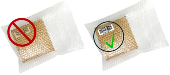 Barcodes must be applied/printed on outside of product packaging such as bubble wrap, as scanners will not be able to effectively scan through plastic material (product packaging should not require opening to properly scan barcode). When possible, barcodes should appear on outside of clear, flat polybags (cellophane material).