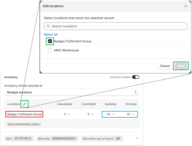 Once integrated, if you want Badger inventory quantities to sync to your Shopify store, be sure to select the Badger location under the "Inventory" section on each product page. You can add the Badger location before inventory is received—available quantities will simply display as zero until products arrive.