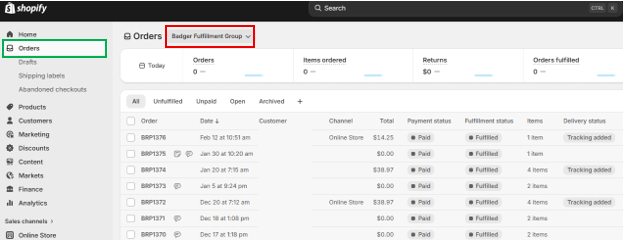 In Shopify, any order items with an ‘Unfulfilled’ status, assigned to the Badger Location will automatically sync to the WMS and get processed. New orders sync within a ~15 minute period.