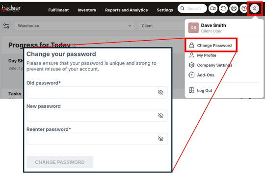 Dashboard -> User icon -> Change Password