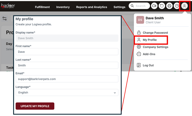 User Icon (upper right): Change password, user name, and login email.