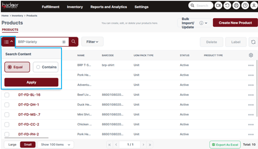 When using the search bar, toggle between Equal or Contains from the dropdown to the left of the search field (determines if the search results must contain an exact or partial match to the text input).