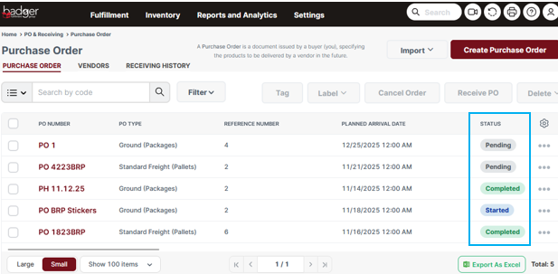 Review the PO Receiving Report in your Dashboard to see Product receipt quantity. Once a Purchase Order status is "Completed", clients will be emailed a confirmation including an Excel copy of the Dashboard PO Receiving Report.