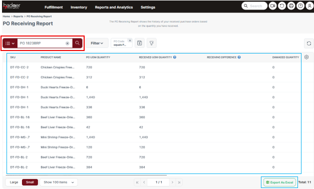 Dashboard -> Reports and Analytics -> PO Receiving Report
