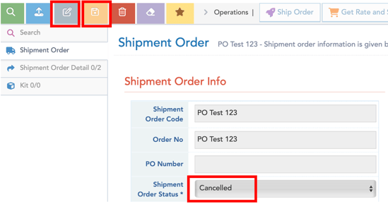 In Shipment Order screen, select Edit button (grey icon, upper left). Dropdown-select Shipment Order Status* to Cancelled. Select Save button (orange icon, upper left); the order is now successfully cancelled, and will not be processed.