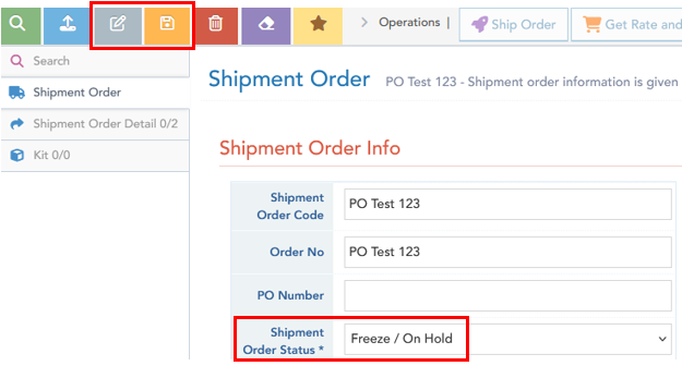 In Logiwa Shipment Order screen, select Edit button (grey icon, upper left). Dropdown-select Shipment Order Status* to Freeze / On Hold. Select Save button (orange icon, upper left); the order is now successfully on hold, and will not be processed.