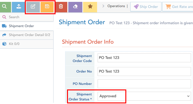 In Logiwa Shipment Order screen, select Edit button (grey icon, upper left). Dropdown-select Shipment Order Status* to Approved. Select Save button (orange icon, upper left). The order is now available for order processing; if sufficient inventory is on hand, system will automatically allocate and update order status to Started.