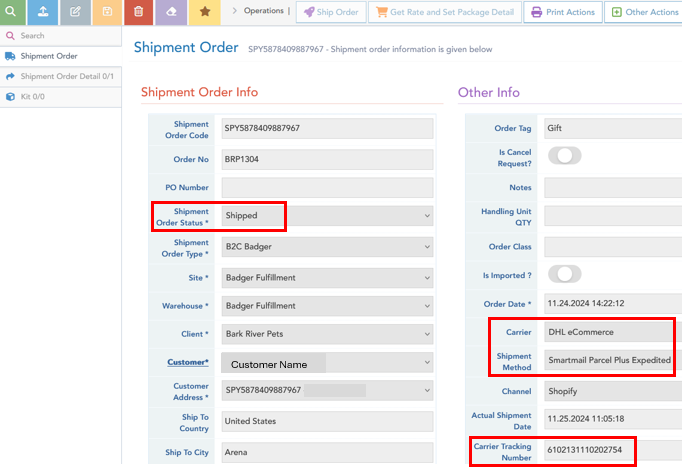 - Shipment Order Code / Customer Order No