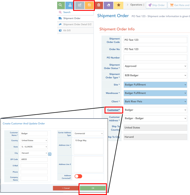In Logiwa Shipment Order screen, select Edit button (grey icon, upper left). Select the Customer* link, which will open the customer info window. Make necessary address updates, and hit OK. Select Save button (orange icon, upper left); the order address is now successfully updated.