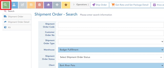 WMS->Order Management->Shipment Order->Select Search (green eyeglass icon)