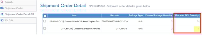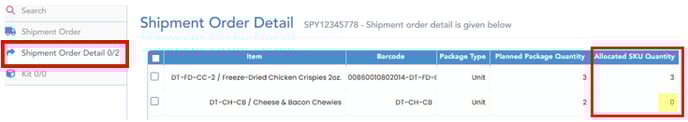 Select Shipment Order Detail tab (on left) to view order item info; "Allocated SKU Quantity" is shown on the right:
