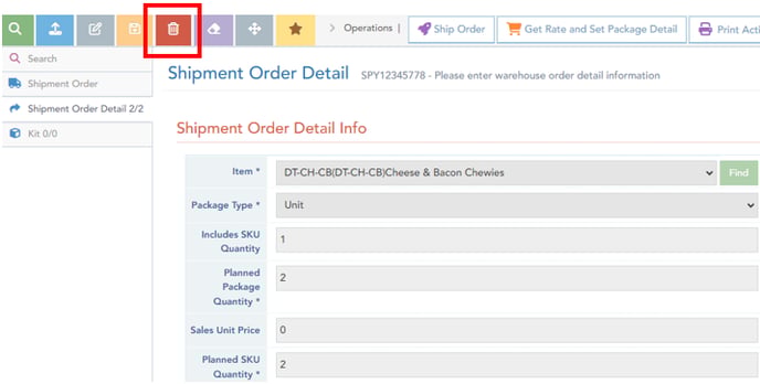 To manually remove/delete the order-item directly in Logiwa, select the item and then select the delete button (red icon, upper left):