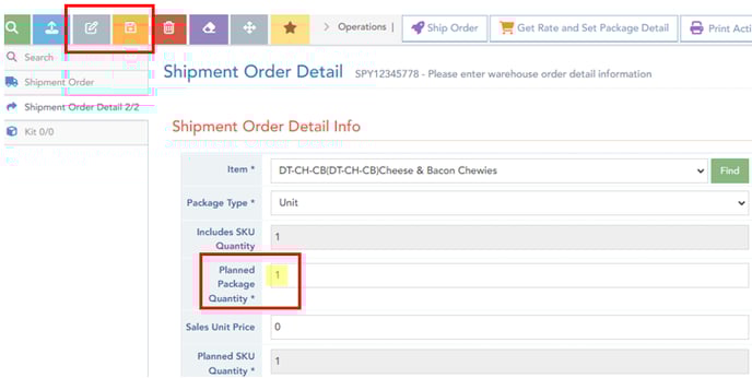 To manually edit an order item directly in Logiwa, select the item, then select the edit button (grey icon), update the Planned Package Quantity*, and select save (orange icon).