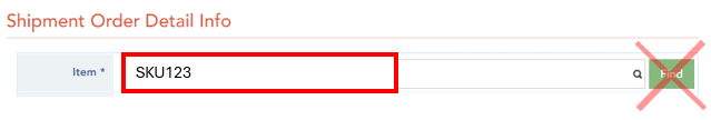 To enter a SKU in the Item* field, click in the text box, and enter an entire/or part of a SKU, item barcode, or item description and hit enter key. Do not use the Find (green button) to enter SKUs.