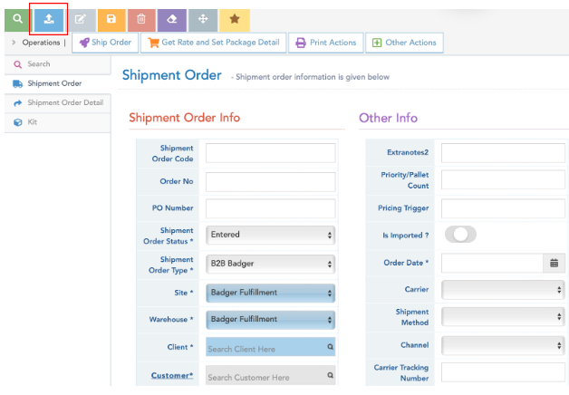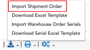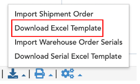 In the Shipment Order Screen, select Download Excel Template from the download/upload button (blue arrow icon, bottom left toolbar).