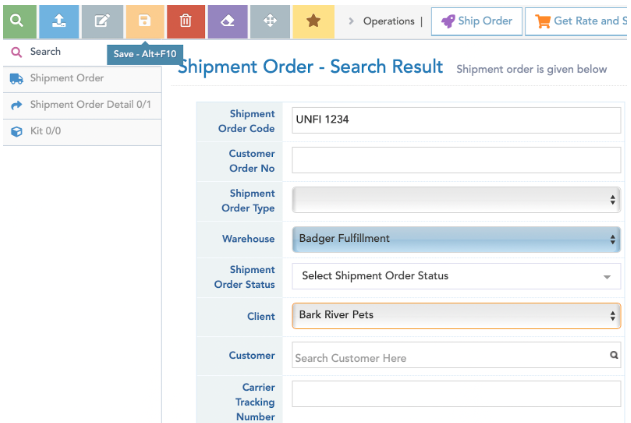 Once above info is filled out, hit the Save button (orange icon, upper left). Additional fields can be edited/specified after creating the shipment.
