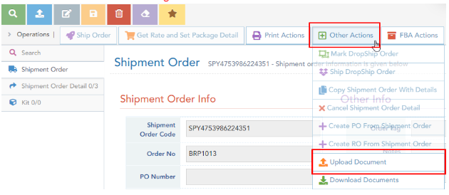 To attach a file directly in the Shipment Order (B2B), dropdown Other Actions (top toolbar), and select Upload Document. Attach the file in the file search window.