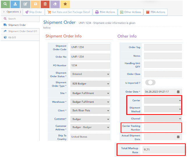 In order to properly specify a carrier, a Shipment Method field (below) must also be designated accordingly.