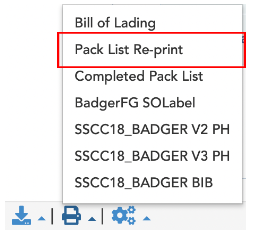 A packing list may be printed, only once a shipment is processed/marked “shipped” in Logiwa (this assures document accuracy in accordance to order processing). Select Pack List Re-print from the printer icon (icon, bottom left toolbar):